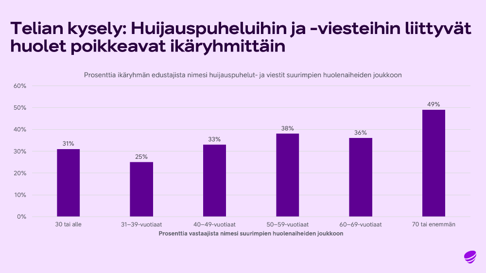 Ikäryhmien välillä on huomattavia eroja huijauspuheluihin ja -viesteihin liittyvissä huolissa. Telian kyselyn mukaan kaikista eniten huolta kantavat yli 70-vuotiaat, joista liki puolet nimeää erilaiset huijaukset kolmen suurimman huolenaiheen joukkoon, kun puhutaan puhelin- ja nettiyhteyksien tietoturvasta.