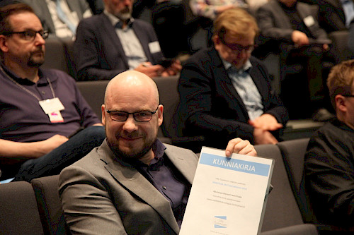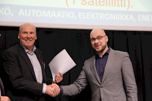 Ulla Tuomisen säätiön hallituksen jäsen Seppo Siivola luovutti Aalto-yliopiston Sähkötekniikan korkeakoulun apulaisprofessori Jaan Praksille Sähkössä on tulevaisuus -palkinnon.